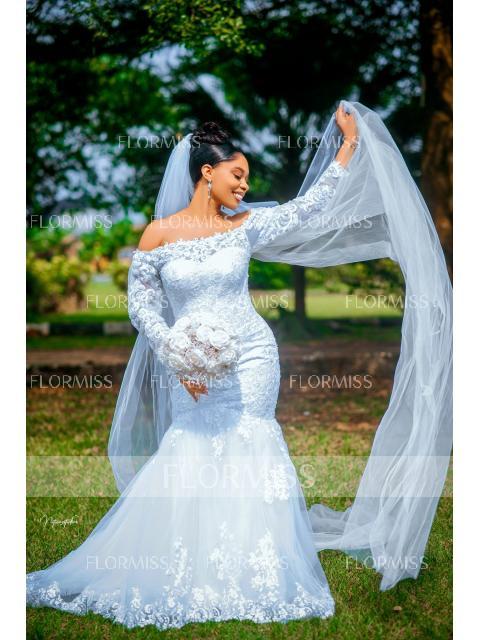 • Trumpet/Mermaid Off-the-Shoulder Sweep Train Tulle Wedding Dresses With Appliques Lace