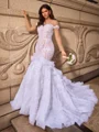 This breathtaking mermaid wedding dress features a scoop neckline and long sleeves, creating a refined and elegant look. Adorned with intricate lace appliques, the gown exudes romantic charm and timeless sophistication. Crafted from luxurious organza, the fabric offers a lightweight and ethereal feel while maintaining its structured silhouette. The figure-hugging mermaid design beautifully accentuates the bride's curves, flowing into a dramatic chapel train that adds grandeur and grace. Perfect for a formal wedding ceremony, this dress combines delicate lace details, elegant long sleeves, and a stunning train to create a truly unforgettable bridal look.