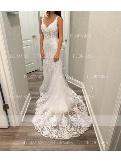 • Trumpet/Mermaid V-neck Chapel Train Tulle Wedding Dresses With Appliques Lace